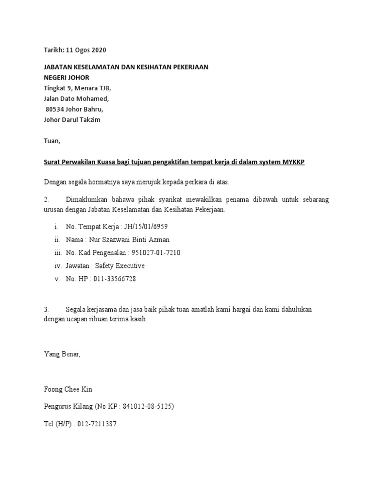 Contoh Surat Perwakilan Kuasa Tempat Kerja Untuk Jkkp Kumpulan Contoh Terbaru